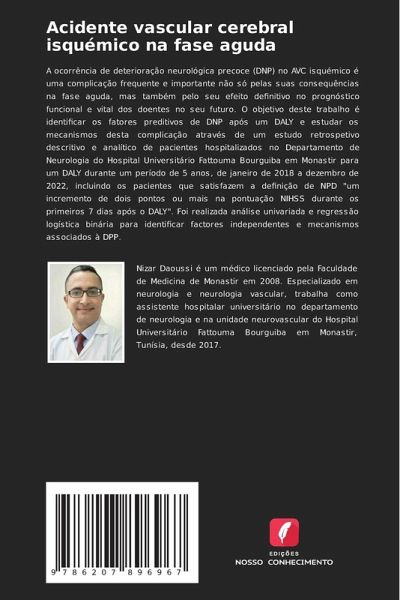 A ocorrência de deterioração neurológica precoce (DNP) no AVC isquémico é uma complicação frequente e importante não só pelas suas consequências na fase aguda, mas também pelo seu efeito definitivo no prognóstico funcional e vital dos doentes no seu futuro. O objetivo deste trabalho é identificar os fatores preditivos de DNP após um DALY e estudar os mecanismos desta complicação através de um estudo retrospetivo descritivo e analítico de pacientes hospitalizados no Departamento de Neurologia do Hospital Universitário Fattouma Bourguiba em Monastir para um DALY durante um período de 5 anos, de janeiro de 2018 a dezembro de 2022, incluindo os pacientes que satisfazem a definição de NPD "um incremento de dois pontos ou mais na pontuação NIHSS durante os primeiros 7 dias após o DALY". Foi realizada análise univariada e regressão logística binária para identificar factores independentes e mecanismos associados à DPP.