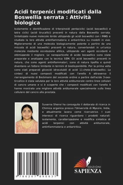 Isolamento e identificazione di triterpinoidi pentaciclici (acidi boswellici) e tetra ciclici (acidi tirucallici) presenti in natura dalla Boswellia serrata. Sintetizzato nuove molecole ibride utilizzando gli acidi boswellici con i FANS e studiato la loro attività antinfiammatoria e antiartritica su modelli in vivo. Miglioramento di una molecola biologicamente potente a partire da una miscela di acidi boswellici presenti in natura, convertendoli in un'unica molecola mediante ossidazione allilica, utilizzando vari agenti ossidanti e ottimizzando il migliore. Le nanoparticelle di acido boswellico sono state preparate e analizzate con la tecnica SEM. Gli acidi boswellici presenti in natura, che sono agenti antinfiammatori, sono di natura lipofila e quindi diventano un fattore limitante in termini di biodisponibilità. Per la prima volta sono stati preparati glicosidi idrosolubili di acidi 11-cheto-¿-boswellici. La sintesi di nuovi composti modificati con l'anello A attraverso il riarrangiamento di Beckmann del secondo ordine a partire dall'acido 3-oxo-tircallico è stata valutata per la loro attività antitumorale contro linee cellulari di cancro umano e si è scoperto che i composti modificati con l'anello A hanno mostrato una migliore attività antitumorale specialmente sulla linea cellulare del cancro alla prostata.