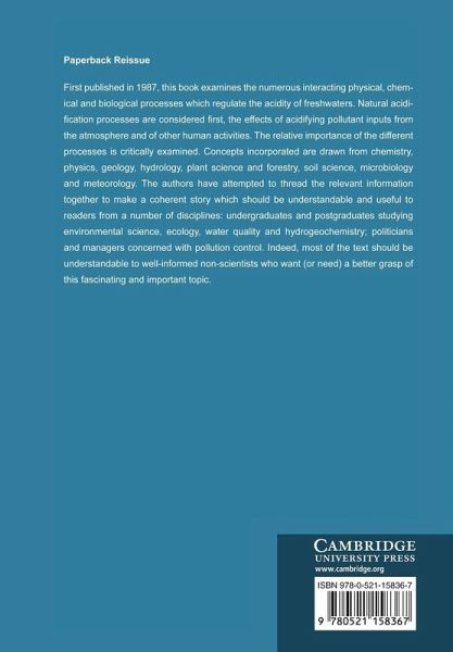 First published in 1987, this book examines the numerous interacting physical, chemical and biological processes which regulate the acidity of freshwaters. Natural acidification processes are considered first, the the effects of acidifying pollutant inputs from the atmosphere and of other human activities. The relative importance of the different processes is critically examined. Concepts incorporated are drawn from chemistry, physics, geology, hydrology, plant science and forestry, soil science, microbiology and meteorology. The authors have attempted to thread the relevant information together to make a coherent story which should be understandable and useful to readers from a number of disciplines: undergraduates and postgraduates studying environmental science, ecology, water quality and hydrogeochemistry; politicians and managers concerned with pollution control. Indeed, most of the text should be understandable to well-informed non-scientists who want (or need) a better grasp of this fascinating and important topic.