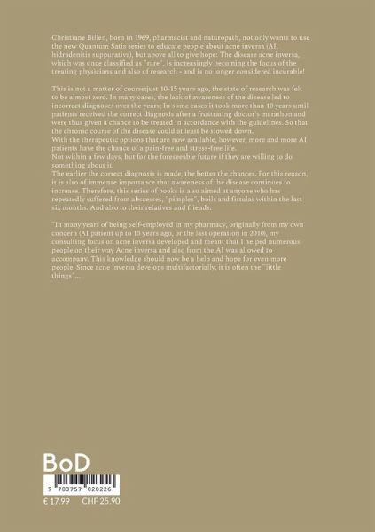 Christiane Billen, born in 1969, pharmacist and naturopath, not only wants to use the new Quantum Satis series to educate people about acne inversa (AI, hidradenitis suppurativa), but above all to give hope:The disease acne inversa, which was once classified as "rare", is increasingly becoming the focus of the treating physicians and also of research - and is no longer considered incurable!This is not a matter of course:just 10-15 years ago, the state of research was felt to be almost zero. In many cases, the lack of awareness of the disease led to incorrect diagnoses over the years; In some cases it took more than 10 years until patients received the correct diagnosis after a frustrating doctor's marathon and were thus given a chance to be treated in accordance with the guidelines. So that the chronic course of the disease could at least be slowed down.With the therapeutic options that are now available, however, more and more AI patients have the chance of a pain-free and stress-free life.Not within a few days, but for the foreseeable future if they are willing to do something about it.The earlier the correct diagnosis is made, the better the chances. For this reason, it is also of immense importance that awareness of the disease continues to increase. Therefore, this series of books is also aimed at anyone who has repeatedly suffered from abscesses, "pimples", boils and fistulas within the last six months. And also to their relatives and friends."In many years of being self-employed in my pharmacy, originally from my own concern (AI patient up to 13 years ago, or the last operation in 2010), my consulting focus on acne inversa developed and meant that I helped numerous people on their way Acne inversa and also from the AI was allowed to accompany. This knowledge should now be a help and hope for even more people. Since acne inversa develops multifactorially, it is often the "little things"...It is the recognition of individual triggers in combination with support from the "right" therapists (experienced specialists in dermatology and plastic surgery, naturopaths, psychologists, specialized wound centers) that paves the way to healing."
