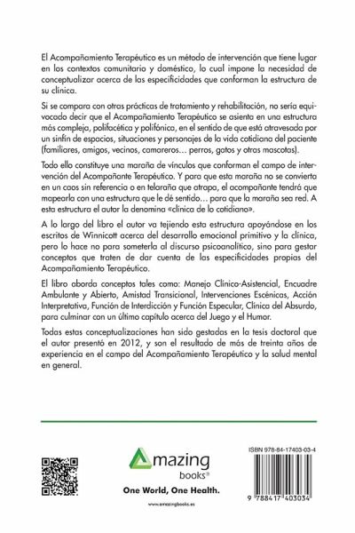 El Acompañamiento Terapéutico es un método de intervención que tiene lugar en los contextos comunitario y doméstico, lo cual impone la necesidad de conceptualizar acerca de las especificidades que conforman la estructura de su clínica. Si se compara con otras prácticas de tratamiento y rehabilitación, no sería equi¬vocado decir que el Acompañamiento Terapéutico se asienta en una estructura más compleja, polifacética y polifónica, en el sentido de que está atravesada por un sinfín de espacios, situaciones y personajes de la vida cotidiana del paciente (familiares, amigos, vecinos, camareros... perros, gatos y otras mascotas). Todo ello constituye una maraña de vínculos que conforman el campo de inter-vención del Acompañante Terapéutico. Y para que esta maraña no se convierta en un caos sin referencia o en telaraña que atrapa, el acompañante tendrá que mapearla con una estructura que le dé sentido... para que la maraña sea red. A esta estructura el autor la denomina clínica de lo cotidiano. A lo largo del libro el autor va tejiendo esta estructura apoyándose en los escritos de Winnicott acerca del desarrollo emocional primitivo y la clínica, pero lo hace no para someterla al discurso psicoanalítico, sino para gestar conceptos que traten de dar cuenta de las especificidades propias del Acompañamiento Terapéutico.