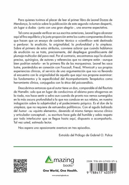 Para quienes tuvimos el placer de leer el primer libro de Leonel Dozza de Mendonça, la noticia sobre la publicación de este segundo volumen despertó, sin lugar a dudas −junto con una gran alegría−, una enorme expectativa. Tal como se puede verificar en sus escritos anteriores, Leonel logra alcanzar aquí el fino equilibrio y la justa proporción entre los cuatro componentes divinos que hacen que un ensayo de carácter técnico o «científico» esté destinado a perdurar: la erudición, la originalidad, la profundidad y la simpleza. Sobre el primero de estos atributos, conviene aclarar que cuando hablamos de erudición no se trata, precisamente, del despliegue grandilocuente del plumaje multicolor del pavo real. Por el contrario, encontramos aquí la alusión precisa, quirúrgica, de autores y referencias que no siempre están −aunque bien podrían estarlo− en la primera fila de las marquesinas. Leonel les saca lustre, poniéndolos en conexión con Foucault, Freud, Winnicott y sus propias experiencias clínicas, al servicio de una argumentación que nos va llevando al encuentro con la originalidad de aquello que aquí nos propone examinar: los fundamentos y la especificidad del Acompañamiento Terapéutico como herramienta clínica, conjugados con la ética del psicoanálisis. Descubrimos entonces que el autor tiene un don, comparable al del flautista de Hamelín: solo que en lugar de conducirnos al abismo para ahogarnos en la riada, nos hace sentir a salvo aun cuando de pronto nos vemos sumergidos en la más oscura profundidad a la que nos conduce en sus relatos, en nuestra indagación sobre la subjetividad y el padecimiento psíquico. Es el don de la simpleza, que no requiere de estruendos polifónicos. Con el agudo balizado del humor −su «quinto elemento», devenido al mismo tiempo recurso clínico y articulador conceptual−, su escritura hace gala del humilde y sabio respeto por todo interlocutor que se llegue hasta aquí, dispuesto a acompañarlo. Tal vez usted, estimado lector. Nos espera una apasionante aventura en tres episodios.