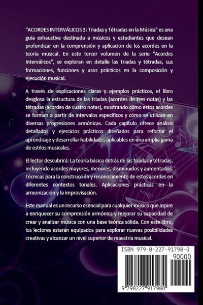 "ACORDES INTERVÁLICOS 3: Triadas y Tétradas en la Música" es una guía exhaustiva destinada a músicos y estudiantes que desean profundizar en la comprensión y aplicación de los acordes en la teoría musical. En este tercer volumen de la serie "Acordes Interválicos", se exploran en detalle las triadas y tétradas, sus formaciones, funciones y usos prácticos en la composición y ejecución musical. A través de explicaciones claras y ejemplos prácticos, el libro desglosa la estructura de las triadas (acordes de tres notas) y las tétradas (acordes de cuatro notas), mostrando cómo estos acordes se forman a partir de intervalos específicos y cómo se utilizan en diversas progresiones armónicas. Cada capítulo ofrece análisis detallados y ejercicios prácticos diseñados para reforzar el aprendizaje y desarrollar habilidades aplicables en una amplia gama de estilos musicales. El lector descubrirá: La teoría básica detrás de las triadas y tétradas, incluyendo acordes mayores, menores, disminuidos y aumentados. Técnicas para la construcción y reconocimiento de estos acordes en diferentes contextos tonales. Aplicaciones prácticas en la armonización y la improvisación. Este manual es un recurso esencial para cualquier músico que aspire a enriquecer su comprensión armónica y mejorar su capacidad de crear y analizar música con una base teórica sólida. Con este libro, los lectores estarán equipados para explorar nuevas posibilidades creativas y alcanzar un nivel superior de maestría musical.