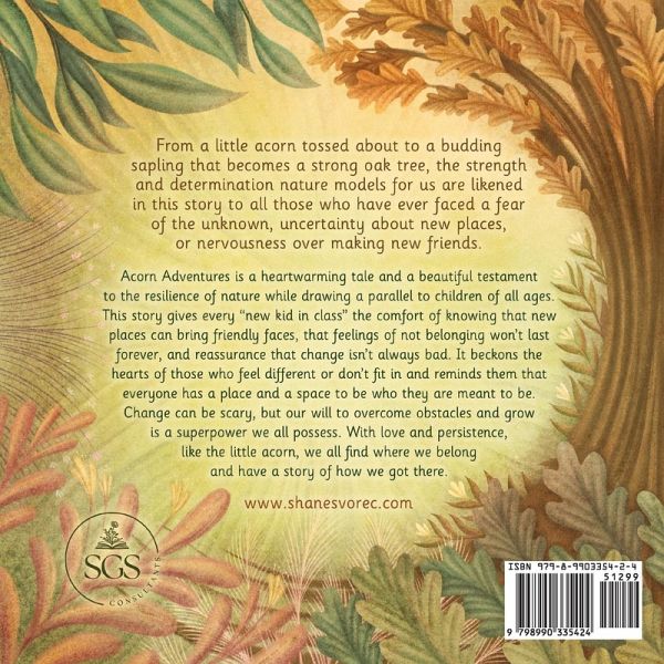 From a little acorn tossed about to a budding sapling that becomes a strong oak tree, the strength and determination nature models for us are likened in this story to all those who have ever faced a fear of the unknown, uncertainty about new places, or nervousness over making new friends. Acorn Adventures is a heartwarming tale and a beautiful testament to the resilience of nature while drawing a parallel to children of all ages. This story gives every "new kid in class" the comfort of knowing that new places can bring friendly faces, that feelings of not belonging won't last forever, and reassurance that change isn't always bad. It beckons the hearts of those who feel different or don't fit in and reminds them that everyone has a place and a space to be who they are meant to be. Change can be scary, but our will to overcome obstacles and grow is a superpower we all possess. With love and persistence, like the little acorn, we all find where we belong and have a story of how we got there.