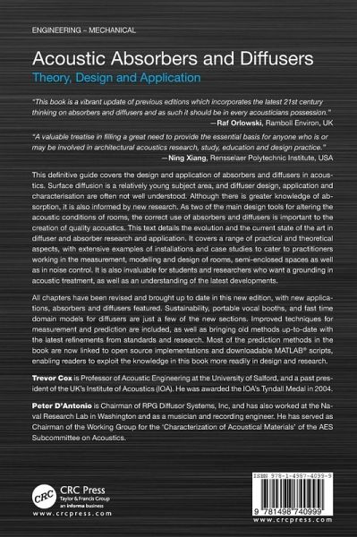 This definitive guide covers the design and application of absorbers and diffusers. Surface diffusion is a relatively young subject area, and diffuser design, application and characterisation are often not well understood by practitioners. Although absorption is more widely understood, it is also informed by new research. This text details the evolution and the current state of the art in diffuser research and application along with absorption. It covers a range of practical and theoretical aspects of absorbers and diffusers and extensive examples of installations for practitioners working in the measurement, modelling and design of rooms and semi-enclosed spaces as well as in noise control.