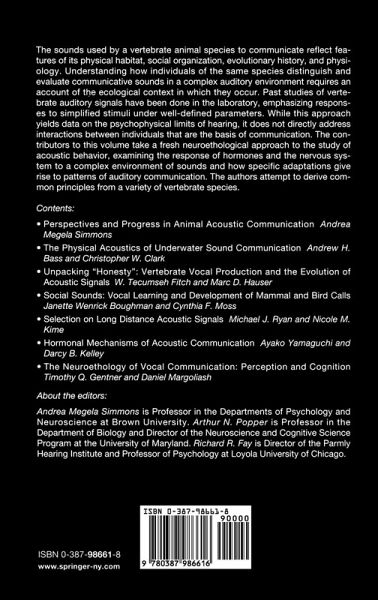 In order to communicate, animals send and receive signals that are subject to their particular anatomical, psychological, and environmental constraints. This SHAR volume discusses both the production and perception of acoustic signals. Chapters address the information that animals communicate, how the communication is developed and learned, and how communication systems have adapted and evolved within species. The book will give examples from a variety of species.