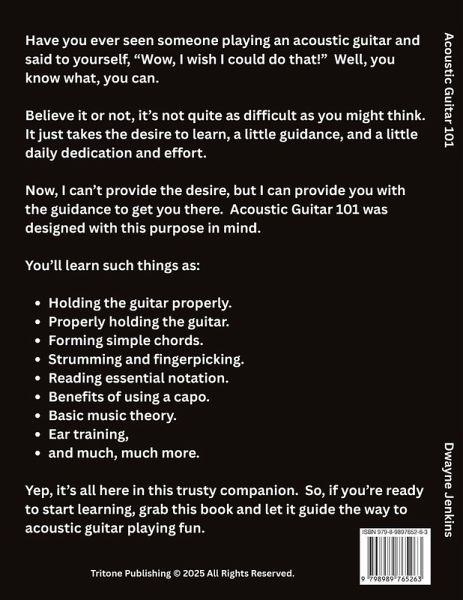Acoustic Guitar 101 is a comprehensive course for beginners. A get started training guide for those who've always wanted to play the acoustic guitar, but didn't know where to start. Well, now they do. All in an easy step-by-step method that anyone can learn from. With full-color pictures, diagrams, and notation that is easy to read and understand. You'll learn such things as:The anatomy of the guitar. Holding the guitar and using a pick. Chords that are commonly found in many popular songs. Strumming and fingerpicking chords. Creating rhythm and timing. Basic music theory. Ear training. And much, much more. If you are serious about wanting to play the acoustic guitar, then this is the book for you. Acoustic Guitar 101 will be sure to get you there in style. So grab the book and get started today!