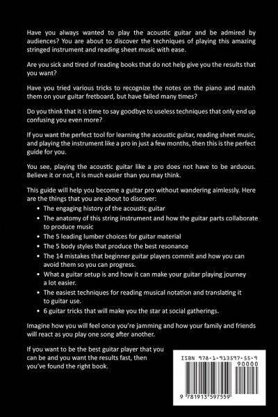 Have you always wanted to play the acoustic guitar and be admired by audiences? You are about to discover the techniques of playing this amazing stringed instrument and reading sheet music with ease.Are you sick and tired of reading books that do not help give you the results that you want?Have you tried various tricks to recognize the notes on the piano and match them on your guitar fretboard, but have failed many times?Do you think that it is time to say goodbye to useless techniques that only end up confusing you even more?If you want the perfect tool for learning the acoustic guitar, reading sheet music, and playing the instrument like a pro in just a few months, then this is the perfect guide for you.You see, playing the acoustic guitar like a pro does not have to be arduous. Believe it or not, it is much easier than you may think.This guide will help you become a guitar pro without wandering aimlessly. Here are the things that you are about to discover:The engaging history of the acoustic guitar The anatomy of this string instrument and how the guitar parts collaborate to produce music The 5 leading lumber choices for guitar material The 5 body styles that produce the best resonance The 14 mistakes that beginner guitar players commit and how you can avoid them so you can progress. What a guitar setup is and how it can make your guitar playing journey a lot easier. The easiest techniques for reading musical notation and translating it to guitar use. 6 guitar tricks that will make you the star at social gatherings. Imagine how you will feel once you're jamming and how your family and friends will react as you play one song after another.If you want to be the best guitar player that you can be and you want the results fast, then you've found the right book.