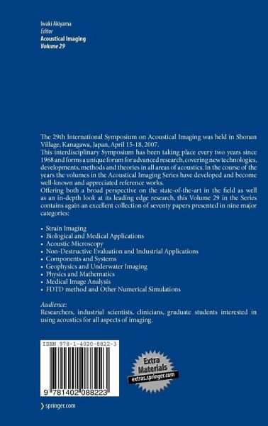 The 29th International Symposium on Acoustical Imaging was held in Shonan Village, Kanagawa, Japan, April 15-18, 2007. This interdisciplinary Symposium has been taking place every two years since 1968 and forms a unique forum for advanced research, covering new technologies, developments, methods and theories in all areas of acoustics. In the course of the years the volumes in the Acoustical Imaging Series have developed and become well-known and appreciated reference works.
