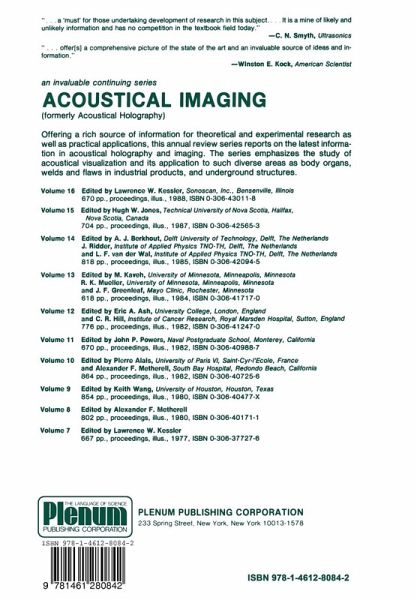 The 17th International Symposium on Acoustical Imaging was held at Tohoku University, Sendai, Japan, during May 31-June 2, 1988. The symposium was organized by the ultrasonics research group of Tohoku University and the IEEE ijFFC Society, Tokyo Chapter. Of the 128 papers submitted, 88 were presented during the symposium, which comprised 144 researchers from 13 countries. This volume contains 81 papers as the record of the symposium and is clas sified into the following sections: (1) Acoustic Microscopy and its Applications; (2) Non-Destructive Evaluation; (3) Signal Processing of Images; (4) Acoustic Measurements and Physical Acoustics; (5) Medical Ultrasonic Diagnostics; (6) Acoustic Sensors; (7) Acoustic Holography and Tomography; (8) Seismic Exploration; and (9) Imaging Instrumentation and Other Techniques. A number of the papers submitted were associated with medical ultrasonic diagnostics and acoustic microscopy, reflecting a major activity in acousti cal imaging at Tohoku University. Accordingly, two invited talks were focused on this area: acoustic microscopy by Dr. G. A. D. Briggs of the University of Oxford and medical ultrasonics by Prof. M. Tanaka of Tohoku University. In light of the history of research in this field at our university, we are delighted to have had the opportunity to host the 17th symposium.