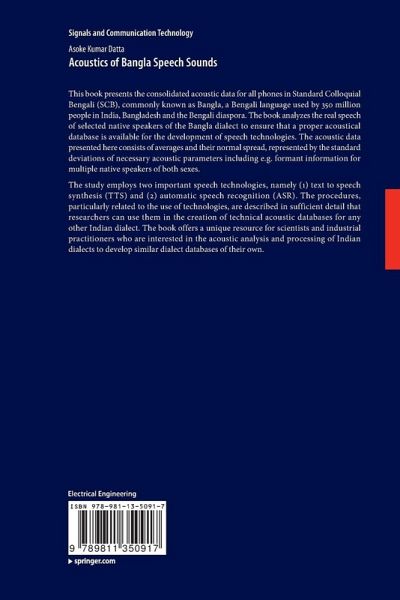 This book presents the consolidated acoustic data for all phones in Standard Colloquial Bengali (SCB), commonly known as Bangla, a Bengali language used by 350 million people in India, Bangladesh, and the Bengali diaspora. The book analyzes the real speech of selected native speakers of the Bangla dialect to ensure that a proper acoustical database is available for the development of speech technologies. The acoustic data presented consists of averages and their normal spread, represented by the standard deviations of necessary acoustic parameters including e.g. formant information for multiple native speakers of both sexes.