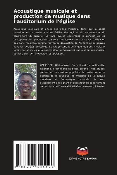 Acoustique musicale et effets des sons musicaux forts sur la santé humaine, en particulier sur les fidèles des églises du sud-ouest et du centre-nord du Nigeria. Le livre évalue également le concept et les perceptions des productions de sons musicaux en relation avec l'utilisation des sons musicaux comme moyen de domination de l'espace et du pouvoir dans les sociétés africaines. L'ouvrage conclut enfin que les sons musicaux forts sont associés à la possession du pouvoir et que plus le son musical est fort, plus son producteur est puissant.