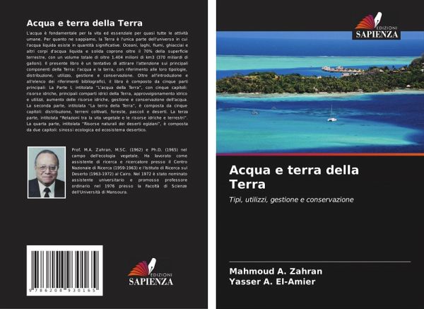 L'acqua è fondamentale per la vita ed essenziale per quasi tutte le attività umane. Per quanto ne sappiamo, la Terra è l'unica parte dell'universo in cui l'acqua liquida esiste in quantità significative. Oceani, laghi, fiumi, ghiacciai e altri corpi d'acqua liquida e solida coprono oltre il 70% della superficie terrestre, con un volume totale di oltre 1.404 milioni di km3 (370 miliardi di galloni). Il presente libro è un tentativo di attirare l'attenzione sui principali componenti della Terra: l'acqua e la terra, con riferimento alle loro tipologie, distribuzione, utilizzo, gestione e conservazione. Oltre all'introduzione e all'elenco dei riferimenti bibliografici, il libro è composto da cinque parti principali: La Parte I, intitolata "L'acqua della Terra", con cinque capitoli: risorse idriche, principali comparti idrici della Terra, approvvigionamento idrico e utilizzi, aumento delle risorse idriche, gestione e conservazione dell'acqua. La seconda parte, intitolata "La terra della Terra", è composta da cinque capitoli: distribuzione, terreni coltivati, foreste, pascoli e deserti. La terza parte, intitolata "Relazioni tra la vita vegetale e le risorse idriche e terrestri". La quarta parte, intitolata "Risorse naturali dei deserti egiziani", è composta da due capitoli: sinossi ecologica ed ecosistema desertico.
