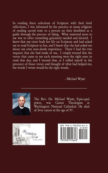 In sending these selections of Scripture with their brief reflections, I was informed by the practice in many religions of reading sacred texts to a person on their deathbed as a guide through the process of dying. What mattered most to me was to offer something genuinely needed and desired. I knew that my sister built her life on Scripture and had asked me to read Scripture to her, and I knew that she had asked me about my own near-death experience. There I had the two requests that she had made of me. I simply trusted that the verses that came to me each morning were the right ones to send that day, and I trusted that, as I stilled myself in the presence of those verses and thought of what had helped me, the words I wrote would be the right words. Michael Wyatt