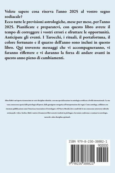 Volete sapere cosa riserva l'anno 2025 al vostro segno zodiacale? Ecco tutte le previsioni astrologiche, mese per mese, per l'anno 2025. Pianificate e preparatevi, con questo libro avrete il tempo di correggere i vostri errori e sfruttare le opportunità. Anticipate gli eventi. I Tarocchi, i rituali, il portafortuna, il colore fortunato e il quarzo dell'anno sono inclusi in questo libro. Qui troverete messaggi che vi accompagneranno, vi faranno riflettere e vi daranno la forza di andare avanti in questo anno pieno di cambiamenti.