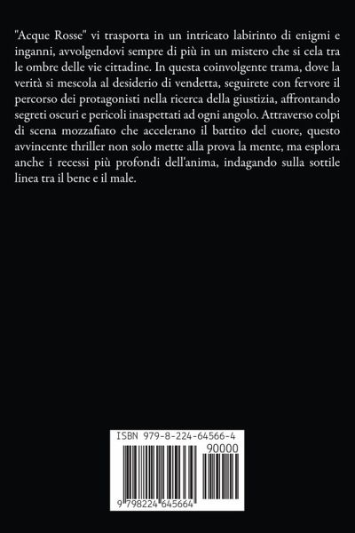 "Acque Rosse" vi trasporta in un intricato labirinto di enigmi e inganni, avvolgendovi sempre di più in un mistero che si cela tra le ombre delle vie cittadine. In questa coinvolgente trama, dove la verità si mescola al desiderio di vendetta, seguirete con fervore il percorso dei protagonisti nella ricerca della giustizia, affrontando segreti oscuri e pericoli inaspettati ad ogni angolo. Attraverso colpi di scena mozzafiato che accelerano il battito del cuore, questo avvincente thriller non solo mette alla prova la mente, ma esplora anche i recessi più profondi dell'anima, indagando sulla sottile linea tra il bene e il male. Con una prosa incalzante, l'autore Giancarlo Del Crime vi invita a immergervi in questa narrativa coinvolgente ed emozionante. Preparatevi per un'avventura letteraria che vi terrà incollati fino all'ultima pagina. "Acque Rosse" non è semplicemente un libro, ma un'esperienza che vi cambierà per sempre. Siete pronti a esplorare le profondità dell'ipnosi? Romanzo criminale, thriller, poliziesco, crime fiction, narrativa criminale, libro giallo, detective fiction, libri gialli.