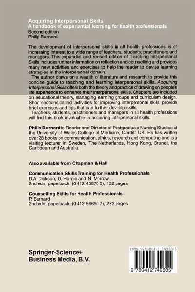 The development of interpersonal skills in all health professions is of increasing interest to a wide range of teachers, students, practitioners and managers. This expanded and revised edition of Teaching Interpersonal Skills includes further information on reflection and counselling, and provides many new activities and exercises to help the reader devise learning strategies in the interpersonal domain. Chapters are included on educational theory, managing learning groups and curriculum design. Short sections called "activities for improving interpersonal skills" provide brief exercises and tips that can further develop skills.