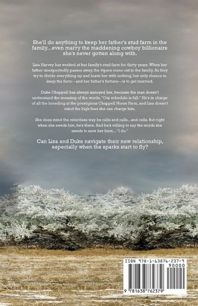 She'll do anything to keep her father's stud farm in the family...even marry the maddening cowboy billionaire she's never gotten along with. Lisa Harvey has worked at her family's stud farm for thirty years. When her father unexpectedly passes away, the vipers come out in the family. As they try to divide everything up and leave her with nothing, her only chance to keep the farm-and her father's fortune-is to get married. Duke Chappell has always annoyed her, because the man doesn't understand the meaning of the words, "Our schedule is full." He's in charge of all the breeding at the prestigious Chappell Horse Farm, and Lisa doesn't mind the high fees she can charge him. She does mind the relentless way he calls and calls...and calls. But right when she needs him, he's there. And he's willing to say the words she needs to save her farm... "I do." Can Lisa and Duke navigate their new relationship, especially when the sparks start to fly?