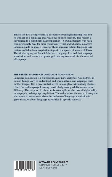 This is the first comprehensive account of prolonged hearing loss and its impact on a language that was once spoken fluently. Although it is currently assumed that hearing loss results in speech deterioration, it is shown that language loss occurs when speakers remain deaf for a long time. The reader is introduced to a significant deaf population â?? postlingually deafened Yoruba speakers who have been deaf for more than twenty years and who have no access to hearing aids or speech therapy. After becoming deaf, they continue to speak Yoruba from memory and â??hearâ? visually through lip reading. These speakers exhibit phonological, lexical and syntactic losses which mirror acquisition patterns attested in the speech of Yoruba children. Based on these similarities, it is argued that a direct link exists between language loss and first language acquisition. It is further argued that prolonged deafness results in language reversal. Finally, the book presents the first description of the sign language and gestures used by deafened speakers to augment their spoken language. These findings will be of value to linguists, speech, language and hearing therapists, anthropologists, Africanists, deaf studies researchers, and non-specialists who are interested in hearing health and wellness.