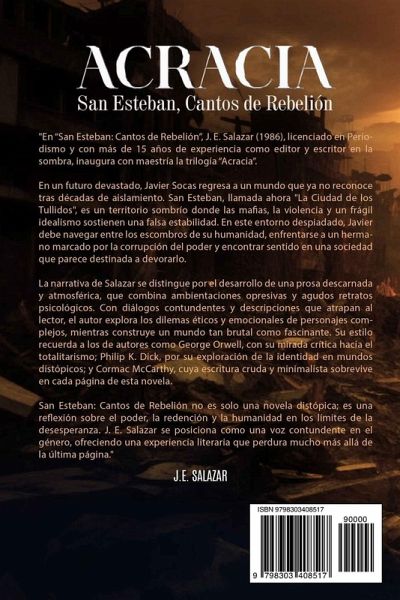 En un futuro sombrío y devastado, Javier Socas es liberado tras cuarenta años de presidio. Su regreso al mundo exterior no es un alivio, sino una confrontación con un lugar que apenas puede reconocer: San Esteban, ahora conocida como "La Ciudad de los Tullidos". Este enclave olvidado es un territorio sin ley, un laberinto de ruinas habitado por parias, donde el orden se sostiene a través de la violencia, la corrupción y la lucha de facciones rivales. San Esteban no es solo un lugar; es un reflejo de todo lo que la humanidad ha perdido. Aquí, las mafias dominan con mano de hierro, mientras la Brigada del Pueblo, una organización nacida de la resistencia, lucha por imponer un nuevo tipo de orden. Pero incluso dentro de la Brigada, los ideales parecen haberse desmoronado, y sus líderes, consumidos por la brutalidad de la ciudad, libran una batalla que parece imposible de ganar. Para Javier, el choque con este mundo no es solo externo, sino profundamente personal. En medio de este caos, debe enfrentarse a los fantasmas de su pasado y reencontrarse con su hermano, Beto, quien se ha convertido en una figura clave dentro de la Brigada. Este reencuentro está cargado de tensiones: Beto representa la adaptabilidad al entorno hostil, pero también la corrupción del poder y la pérdida de humanidad. Los hermanos se ven obligados a navegar una relación marcada por la lealtad familiar, los secretos del pasado y el peso de sus decisiones en un presente desgarrador. Mientras San Esteban se desmorona bajo el peso de su propia brutalidad, una amenaza mayor se cierne desde Solonso, la ciudad que confina a San Esteban en una especie de cuarentena perpetua. Rica, controlada y aparentemente próspera, Solonso no solo estrangula a San Esteban económica y políticamente, sino que también se manifiesta como su antítesis moral. Mientras los tambores de guerra retumban con mayor intensidad, Javier se ve arrastrado a una lucha que no solo pondrá en juego su supervivencia, sino que también lo obligará a decidir qué queda de su humanidad en un mundo donde incluso la libertad se convierte en una trampa. "San Esteban" es una novela distópica que combina la crudeza de un escenario postapocalíptico con un profundo análisis psicológico de sus personajes. En sus páginas, explora temas como la deshumanización, la lucha por el poder, el peso del pasado y la posibilidad -o imposibilidad- de redención. A través de una narrativa evocadora y cargada de tensión, la obra transporta al lector a un universo que, aunque devastador, resulta inquietantemente familiar. ¿Puede Javier encontrar su lugar en un mundo donde incluso la libertad se convierte en una trampa? ¿O será consumido por las mismas fuerzas que han transformado San Esteban en la ciudad de los olvidados?