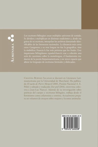 Los escritores bilingües crean múltiples universos de sentido. Se dividen y multiplican en distintas tradiciones y, desde esa grieta de su escritura, interpelan los archivos demasiado identificables de las literaturas nacionales. La distancia más corta entre Gangotena y su otra lengua no fue la geográfica, sino la simbólica: Francia le fue más próxima que los Andes. Este inquietante bilingüismo español-francés trae a colación una serie de cuestiones sobre la monolengua, el fundamento traductor de la poesía hispanoamericana y ese tercer espacio que abren los lenguajes de escrituras liminales y dislocadas. Cristina Burneo Salazar se doctoró en Literatura Latinoamericana por la Universidad de Maryland. Ha publicado El sueño de Pierre Menard (2001, Premio Nacional A. E. Pólit) y editado y traducido Dar piel (2016, entrevista colectiva a Jean-Luc Nancy). Además de su investigación sobre poéticas del cuerpo y escrituras bilingües, trabaja desde el feminismo como columnista y cronista. Actualmente prepara un volumen de ensayos sobre mujeres y lectoras anómalas.