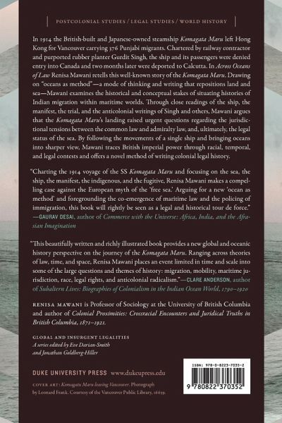 In 1914 the British-built and Japanese-owned steamship Komagata Maru left Hong Kong for Vancouver carrying 376 Punjabi migrants. Chartered by railway contractor and purported rubber planter Gurdit Singh, the ship and its passengers were denied entry into Canada and two months later were deported to Calcutta. In Across Oceans of Law Renisa Mawani retells this well-known story of the Komagata Maru. Drawing on "oceans as method"-a mode of thinking and writing that repositions land and sea-Mawani examines the historical and conceptual stakes of situating histories of Indian migration within maritime worlds. Through close readings of the ship, the manifest, the trial, and the anticolonial writings of Singh and others, Mawani argues that the Komagata Maru's landing raised urgent questions regarding the jurisdictional tensions between the common law and admiralty law, and, ultimately, the legal status of the sea. By following the movements of a single ship and bringing oceans into sharper view, Mawani traces British imperial power through racial, temporal, and legal contests and offers a novel method of writing colonial legal history.