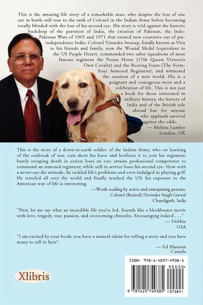This book is not an autobiography. It is a collection of my experiences covering a vast panorama, starting from a remote village in India, moving to a town for schooling, experiencing the devastating tragedies in the family at a tender age, witnessing the travails of people ousted from their home and hearth on the country's Partition in 1947, to joining the Indian Army. I participated in both the Indo-Pak wars of 1965 and 1971. In 1965, while leading a tank troop, my tank was hit in which my operator was killed on the spot, and .I barely survived losing one eye. With this serious disability, I face all the rigors of army life and rise to the rank of Colonel to command an armored regiment and held various coveted senior appointments in the Indian Army. As if the loss of one eye was not the end of it all, ill-luck strikes me once again. In 1992, while still in service, in a freak accident I lost my second eye becoming totally blind. .Determined to regain my self-confidence, I traveled to South Africa where my daughter and her husband (both physicians) arranged for my rehabilitation .My fascinating experience of being able to move about on my own will be of interest to many readers. In due course, my son and daughter moved to the States and I too shifted to experience and enjoy the American way of life. I commend this book to those readers who may be interested in knowing the Indian culture, their ruler life, their perception of an American way of life and those who lauds the survival against odds. Across Seven Seas The Memoir of a War Veteran! This is the amazing life story of a remarkable man, who despite the loss of one eye in battle still rose to the rank of Colonel in the Indian Army before becoming totally blinded with the loss of his second eye. His story is told against the historic backdrop of the partition of India, the creation of Pakistan, the Indo-Pakistan Wars of 1965 and 1971 that created new countries out of pre-independence India. Colonel Virendra Swarup, fondly known as Viru to his friends and family, won the Wound Medal (equivalent to the US Purple Heart), commanded two saber squadrons of most famous regiment the Poona Horse (17th Queen Victoria's Own Cavalry) and the Roaring Fours (The Forty-Four Armored Regiment), and witnessed the creation of a new world. His is a poignant and courageous story and a celebration of life. This is not just a book for those interested in military history, the history of India and of the British role abroad but for anyone who applauds survival against the odds. Melissa Lumley London, UK This is the story of a down-to-earth soldier of the Indian Army, who on learning of the outbreak of war, cuts short his leave and hotfoots it to join his regiment; barely escaping death in action loses an eye; attains professional competence to command an armored regiment; while still in service loses his second eye. How with a never-say-die attitude, he tackled life's problems and even indulged in playing golf. He traveled all over the world and finally reached the US; his exposure to the American way of life is interesting. - Worth reading by active and enterprising persons. Colonel (Retired) Devinder Singh Grewal Chandigarh, India "First, let me say what an incredible life you've led. Sounds like a blockbuster movie with love, tragedy, war, passion, and overcoming obstacles. Encouraging indeed..." Debbie USA "I am excited by your book; you have a natural talent for telling a story and you have many to tell in here". Ed Munson Canada