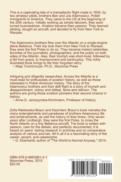 During the summer of 1934, two Polish amateur-pilots, Joe (Józef) and Ben (Boles¿aw) Adamowicz, who immigrated to the US more than twenty years earlier, flew over the Atlantic on a single-engine plane Bellanca. Their trip took them from New York to Warsaw; they were the first Poles to do so. They became instant celebrities, favorites of the journalists, photographers, and the public on both sides of the Atlantic. Alas, their triumph was short-lived, followed by a fall from grace, to imprisonment and bankruptcy. This richly illustrated book brings to life their forgotten story. Written by a historian, journalist and educator Zofia Reklewska-Braun and director, writer, scholar, and author of over 50 books, Dr. Kazimierz Braun, this book was originally published in Poland in 2011.