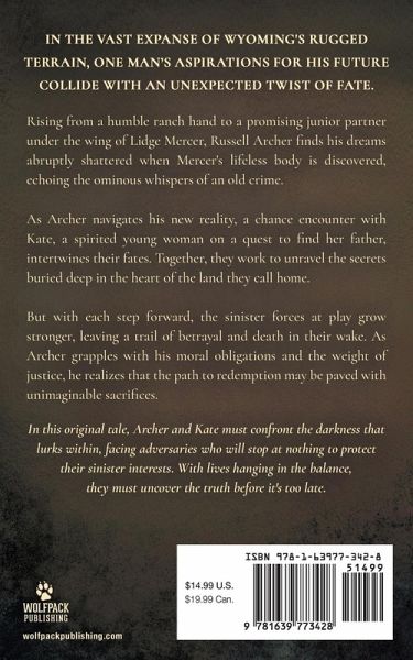 In the vast expanse of Wyoming's rugged terrain, one man's aspirations for his future collide with an unexpected twist of fate. Rising from a humble ranch hand to a promising junior partner under the wing of Lidge Mercer, Russell Archer finds his dreams abruptly shattered when Mercer's lifeless body is discovered, echoing the ominous whispers of an old crime. As Archer navigates his new reality, a chance encounter with Kate, a spirited young woman on a quest to find her father, intertwines their fates. Together, they work to unravel the secrets buried deep in the heart of the land they call home. But with each step forward, the sinister forces at play grow stronger, leaving a trail of betrayal and death in their wake. As Archer grapples with his moral obligations and the weight of justice, he realizes that the path to redemption may be paved with unimaginable sacrifices. In this original tale, Archer and Kate must confront the darkness that lurks within, facing adversaries who will stop at nothing to protect their sinister interests. With lives hanging in the balance, they must uncover the truth before it's too late.