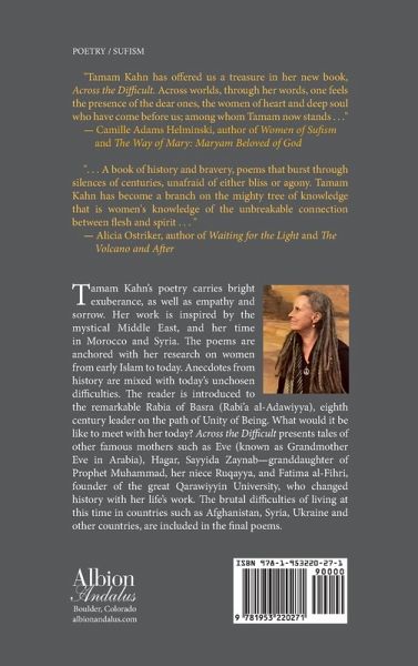 Tamam Kahn's poetry carries bright exuberance, as well as empathy and sorrow. Her work is inspired by the mystical Middle East, and her time in Morocco and Syria. The poems are anchored with her research on women from early Islam to today. Anecdotes from history are mixed with today's unchosen difficulties. The reader is introduced to the remarkable Rabia of Basra (Rabi'a al-Adawiyya), eighth-century leader on the path of Unity of Being. What would it be like to meet with her today? Across the Difficult presents tales of other famous mothers such as Eve (known as Grandmother Eve in Arabia), Hagar, Sayyida Zaynab-granddaughter of Prophet Muhammad, her niece Ruqayya, and Fatima al-Fihri, founder of the great Qarawiyyin University, who changed history with her life's work. The brutal difficulties of living at this time in countries such as Afghanistan, Syria, Ukraine and other countries, are included in the final poems. Winner of The BookFest First Place award for Poetry, Spring 2024, and an International Book Award, 2024