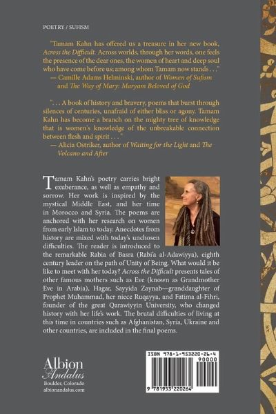 Tamam Kahn's poetry carries bright exuberance, as well as empathy and sorrow. Her work is inspired by the mystical Middle East, and her time in Morocco and Syria. The poems are anchored with her research on women from early Islam to today. Anecdotes from history are mixed with today's unchosen difficulties. The reader is introduced to the remarkable Rabia of Basra (Rabi'a al-Adawiyya), eighth-century leader on the path of Unity of Being. What would it be like to meet with her today? Across the Difficult presents tales of other famous mothers such as Eve (known as Grandmother Eve in Arabia), Hagar, Sayyida Zaynab-granddaughter of Prophet Muhammad, her niece Ruqayya, and Fatima al-Fihri, founder of the great Qarawiyyin University, who changed history with her life's work. The brutal difficulties of living at this time in countries such as Afghanistan, Syria, Ukraine and other countries, are included in the final poems. Winner of The BookFest First Place award for Poetry, Spring 2024, and an International Book Award, 2024