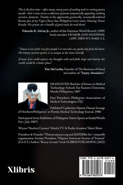 GRADUATED: Bachelor of Science in Medical Technology School: Far Eastern University, Manila Philippines, 1967 Past President: Philippine Association of Medical Technologists (NJ) Published "Capilariais, Mystery Disease Scourge of NorthernPhilippines" at Florida Medical Technology Journal. 1968 Participated Arnis Exhibition of Philippine Native Sports at SeattleWorlds Fair ( July 1967) Winner "Student Canteen" Manila TV & Radio Amateur Talent Show President & Founder "Phiantruepeace.org and KiNDERx Inc" nonprofit organization. Former President, "Filipino American Society of Teaneck" (F.A.S.T.) Author: "Binary Acrostic" book XLIBRIS PUBLISHING (2022)