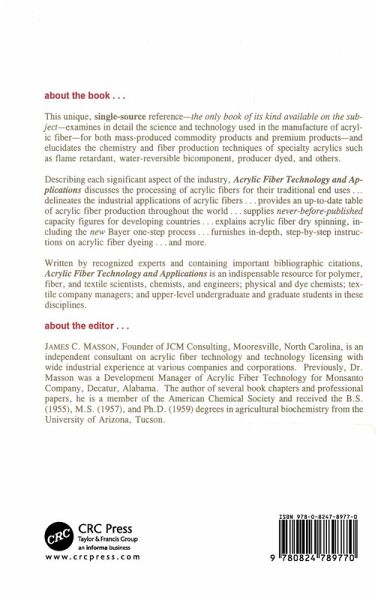This work examines the science and technology used in the manufacture of acrylic fibre for both mass-produced commodity products and premium products. It elucidates the chemistry and fibre production techniques of speciality acrylics such as flame-retardant, water-reversible bicomponent, producer dyed and others. Capacity figures for developing countries are published here.;This work is intended for: polymer, fibre and textile scientists, chemists and engineers; physical and dye chemists; textile company managers; and upper-level undergraduate and graduate students in these disciplines.