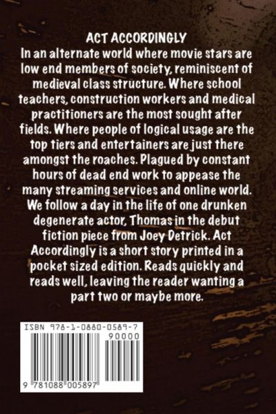 In an alternate world where movie stars are low end members of society, reminiscent of medieval class structure. Where school teachers, construction workers and medical practitioners are the most sought after fields. Where people of logical usage are the top tiers and entertainers are just there amongst the roaches. Plagued by constant hours of dead end work to appease the many streaming services and online world. We follow a day in the life of one drunken degenerate actor, Thomas in the debut fiction piece from Joey Detrick. Act Accordingly is a short story printed in a pocket sized edition. Reads quickly and well, leaving the reader wanting a part two or maybe more.