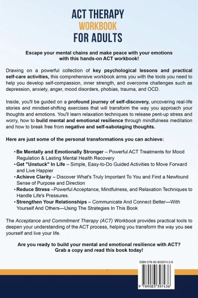 ¿¿ BONUS: FREE ACT MINI GUIDE + 21-DAY ACTION PLAN INSIDE ¿¿ Break free from unhelpful and distressing thoughts, master challenging emotions, and strengthen your mental and emotional resilience with this comprehensive and user-friendly ACT Therapy Workbook. Acceptance and Commitment Therapy (ACT) is one of the most effective ways to strengthen your mindset, improve your emotional health, and build resilience. It achieves this through key psychological lessons taught through simple yet highly effective self-improvement exercises you can do anywhere. Whether you're battling anxiety, depression, anger, shame, mood disorders, inner chaos, phobias, chronic pain, OCD, or simply striving for a happier, more fulfilled life, this book offers a powerful blueprint for mental and emotional freedom. Why Choose This Workbook? ACT Therapy Workbook for Adults goes beyond traditional therapy books by integrating elements of Dialectical Behavior Therapy (DBT) and Cognitive Behavioral Therapy (CBT), offering a rounded approach to managing emotional and psychological challenges. It's not just about coping-it's about thriving. Following are some of the personal transformations you can achieve: Be Mentally and Emotionally Stronger: Be better at adapting to life's happy ups and devastating downs-without breaking. Be more resilient in the face of change and challenges. Be Free from Self-Damaging Thoughts: Read the real-life story of Lizzie (page 58) and how a "joke" (from a family member, no less!) wrecked her self-esteem since childhood. Discover how ACT helped her finally escape this mental trap and how you can use it too! Get "Unstuck" In Life: You're unhappy or know your life can be better, but HOW do you do it? The easy-to-do, guided ACT therapy activities in this book will show you what steps to take. Achieve Clarity: Unhappiness usually stems from a MISMATCH between what you want and what you're doing. Discover what's truly important to you (page 90) and find a newfound sense of purpose and direction. Reduce Your Stress: Learn powerful acceptance, mindfulness, and relaxation techniques to handle life's pressures. Strengthen Your Relationships: Communicate and connect better-with yourself and others-using the strategies in this book. Manage Chronic Pain Better: Improve your quality of life by altering your relationship with pain, enabling you to function better despite chronic conditions. (There's a specific exercise for this on page 86.) Your Journey to a Better You Starts Here... Whether you're new to ACT or looking for material to supplement your healing journey, this workbook is your gateway to a life aligned with your values and desires. (It's also an invaluable tool for therapists, providing ACT-aligned activities to help clients make lasting changes.)