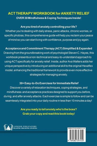 Do you want to break free from the overwhelming grip of anxiety and reclaim your life? Kickstart your path to healing, mental clarity, and emotional resilience with this Acceptance and Commitment Therapy (ACT) self-help workbook. ACT Therapy Workbook for Anxiety Relief is a non-technical, easy-to-understand, and practical guide designed to help you manage anxiety attacks, panic attacks, daily stress, chronic worries, phobias, and other anxiety disorders. Inside, you'll uncover the root causes of anxiety, learn how it affects everything from your brain to your emotions and behavior, and what you can do to break free from the seemingly never-ending cycle of anxiety. Anxiety is draining. It literally zaps the life out of you, leaving you exhausted, overwhelmed, and disconnected from the people and things you care about. But with the right tools, you can experience anxiety relief and ease your mental and emotional suffering. Key Benefits: Understand Your Anxiety: Discover what happens inside your brain during anxiety, how it alters brain function, and how it influences your thoughts, emotions, and behaviors. 30+ Practical Exercises for Immediate Relief: Access relaxation techniques and coping strategies that can reduce anxiety in under 10 minutes a day. Reader-Friendly, Step-by-Step Guidance: Learn how to apply ACT principles in real life, building resilience over time. Mindfulness, Acceptance, and Body-Centric Techniques: Stay grounded in the present, practice radical acceptance, and use your body to ease anxiety. Values-Based Living: Align your actions with your core values for a more meaningful life, free from anxiety's constraints. Customized for Real-Life Application: The workbook is user-friendly and adaptable, making it easy to incorporate these techniques into your daily life. Safe and Supportive Approach: Includes content warnings and safety tips to ensure a secure reading experience. Written by Someone Who Has Battled Anxiety Author Ava Walters shares her personal experience with anxiety, having faced burnout and breakdowns in her mid-30s. After trying various therapies, including DBT, CBT, ACT, and MSBR, she found strategies that helped her regain control. Ava now shares these key lessons and effective strategies to support others on their journey to anxiety relief. Your Journey to Anxiety Relief Starts Here... This book is for anyone struggling with anxiety and seeking genuine relief. Whether you're new to Acceptance and Commitment Therapy (ACT), currently undergoing therapy, or looking for additional resources to enhance and support your healing journey, this guide is designed to help you every step of the way.