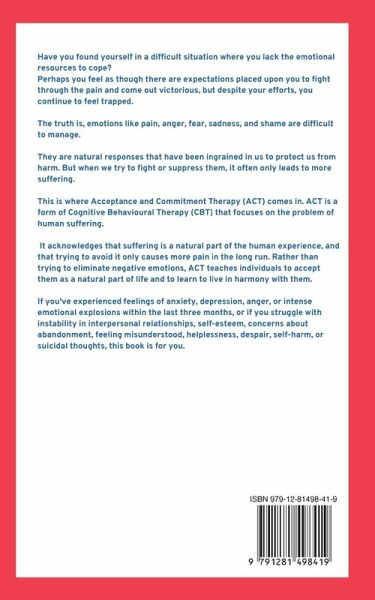 Have you found yourself in a difficult situation where you lack the emotional resources to cope? Perhaps you feel as though there are expectations placed upon you to fight through the pain and come out victorious, but despite your efforts, you continue to feel trapped. The truth is, emotions like pain, anger, fear, sadness, and shame are difficult to manage. They are natural responses that have been ingrained in us to protect us from harm. But when we try to fight or suppress them, it often only leads to more suffering. This is where Acceptance and Commitment Therapy (ACT) comes in. ACT is a form of Cognitive Behavioural Therapy (CBT) that focuses on the problem of human suffering. It acknowledges that suffering is a natural part of the human experience, and that trying to avoid it only causes more pain in the long run. Rather than trying to eliminate negative emotions, ACT teaches individuals to accept them as a natural part of life and to learn to live in harmony with them. If you've experienced feelings of anxiety, depression, anger, or intense emotional explosions within the last three months, or if you struggle with instability in interpersonal relationships, self-esteem, concerns about abandonment, feeling misunderstood, helplessness, despair, self-harm, or suicidal thoughts, this book is for you. By reading this book, you will learn to recognize your thoughts, images, or memories for what they are: products of the mind and not absolute realities. You will also learn to observe your experiences from a more objective standpoint, which will help you better understand and manage your emotions. Additionally, you'll learn to let go of control over your thoughts, allowing them to come and go without judgment. The cycle of human suffering can be a vicious one, with pain leading to negative thinking or self-doubt, which leads to negative feelings like sadness or depression, and so on. But by becoming aware of this cycle and learning to respond to pain differently, we can break free from the cycle and find balance. If you're tired of living someone else's life and ready to take control of your emotions, this book is a must-read.