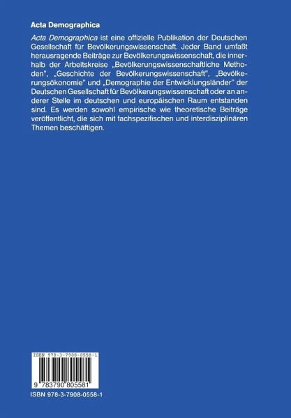 Acta Demographica ist eine offizielle Publikation der Deutschen Gesellschaft für Bevölkerungswissenschaft. Jeder Band umfaßt herausragende Beiträge zur Bevölkerungswissenschaft, die innerhalb der Arbeitskreise "Bevölkerungswissenschaftliche Methoden", "Geschichte der Bevölkerungswissenschaft", "Bevölkerungsökonomie" und "Demographie der Entwicklungsländer" der Deutschen Gesellschaft für Bevölkerungswissenschaft oder an anderer Stelle im deutschen und europäischen Raum entstanden sind. Es werden sowohl empirische wie theoretische Beiträge veröffentlicht, die sich mit fachspezifischen und interdisziplinären Themen beschäftigen.