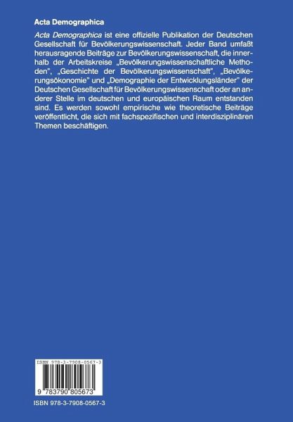 Die Acta Demographica ist eine offizielle Publikation der Deutschen Gesellschaft für Bevölkerungswissenschaft. Jeder Band umfaßt herausragende Beiträge zur Bevölkerungswissenschaft, die innerhalb der Arbeitskreise "Bevölkerungswissenschaftliche Methoden", "Geschichte der Bevölkerungswissenschaft", "Bevölkerungsökonomie" und "Demographie der Entwicklungsländer" der Deutschen Gesellschaft für Bevölkerungswissenschaft oder an anderer Stelle im deutschen und europäischen Raum entstanden sind. Es werden sowohl empirische wie theoretische Beiträge veröffentlicht, die sich mit fachspezifischen und interdisziplinären Themen beschäftigen.…mehr
