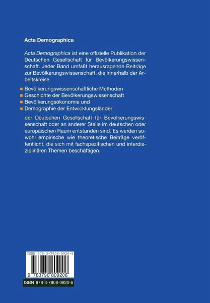 Die Acta Demographica ist eine offizielle Publikation der Deutschen Gesellschaft für Bevölkerungswissenschaft. Jeder Band umfaßt herausragende empirische und theoretische Beiträge, die innerhalb von Arbeitskreisen im deutschen und europäischen Raum entstanden sind.