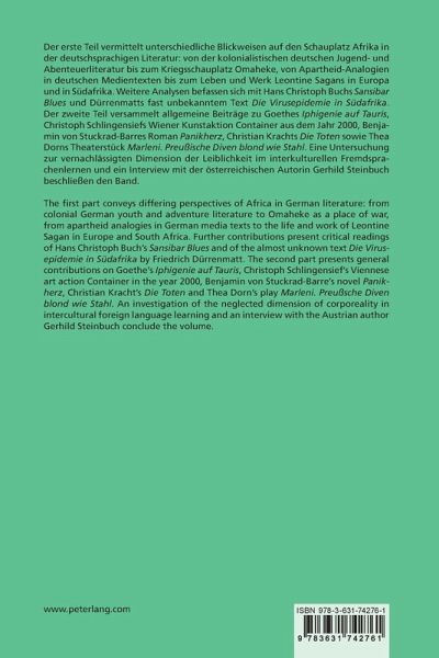 The first part conveys differing perspectives of Africa in German literature: from colonial German youth and adventure literature to Omaheke as a place of war, from apartheid analogies in German media texts to the life and work of Leontine Sagan in Europe and South Africa. Further contributions present critical readings of Hans Christoph Buch's «Sansibar Blues» and of the almost unknown text «Die Virusepidemie in Südafrika» by Friedrich Dürrenmatt. The second part presents general contributions on Goethe's «Iphigenie auf Tauris», Christoph Schlingensief's Viennese art action Container in the year 2000, Benjamin von Stuckrad-Barre's novel «Panikherz», Christian Kracht's «Die Toten» and Thea Dorn's play «Marleni. Preubetasche Diven blond wie Stahl». An investigation of the neglected dimension of corporeality in intercultural foreign language learning and an interview with the Austrian author Gerhild Steinbuch conclude the volume.
