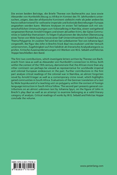 Die ersten beiden Beiträge, die Briefe Therese von Bacherachts aus Java sowie Alexander von Humboldts Bezug zu Afrika im Kontext des 19. Jahrhunderts untersuchen, zeigen, dass der afrikanische Kontinent vielleicht mehr als jeder andere bis heute stellvertretend für weltweite imperiale und koloniale Bestrebungen Europas angesehen werden kann. Weitere Analysen im ersten Teil befassen sich mit wissenschaftlichen Untersuchungen zum Kolonialkrieg in Namibia, einem weitgehend vergessenen Roman Arnold Kriegers und einem aktuellen Krimi, der Gates Communities in Südafrika thematisiert. Es folgen Evaluationen der deutschen Übersetzung eines Textes von Wole Soyinka sowie einer DaF-Unterrichtseinheit in Südafrika zum Thema Polygamie. Im zweiten Teil wird ein fast unbekannter Text von Johanna Spyri vorgestellt, die Figur des John in Brechts Stück Baal neu evaluiert und der Versuch unternommen, Zugehörigkeit auf ihre Validität als literarische Analysekategorie zu prüfen. Kritische Auseinandersetzungen mit Werken von W.G. Sebald und Felicitas Hoppe beschließen den Band.