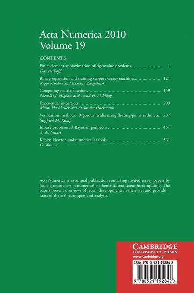 1. Finite element approximation of Eigenvalue problems Daniele Boffi 2. Binary separation and training support vector machines Roger Fletcher and Gaetano Zanghirati 3. Computing matrix functions Nicholas J. Higham and Awad H. Al-Mohy 4. Exponential integrators Marlis Hochbruck and Alexander Ostermann 5. Verification methods: rigorous results using floating-point arithmetic Siegfried M. Rump 6. Inverse problems: a Bayesian perspective A. M. Stuart 7. Kepler, Newton and numerical analysis G. Wanner.