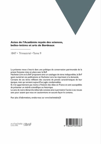 Actes de l'Académie royale des sciences, belles-lettres et arts de Bordeaux Date de l'édition originale: 1847 La présente revue s'inscrit dans une politique de conservation patrimoniale de la presse française mise en place avec la BnF. Hachette Livre et la BnF proposent ainsi un catalogue de titres indisponibles, la BnF ayant numérisé ces publications et Hachette Livre les imprimant à la demande. Certains de ces titres reflètent des courants de pensée caractéristiques de leur époque, mais qui seraient aujourd'hui jugés condamnables. Ils n'en appartiennent pas moins à l'histoire des idées en France et sont susceptibles de présenter un intérêt scientifique ou historique. Le sens de notre démarche éditoriale consiste ainsi à permettre l'accès à ces revues sans pour autant que nous en cautionnions en aucune façon le contenu. Pour plus d'informations, rendez-vous sur www.hachettebnf.fr
