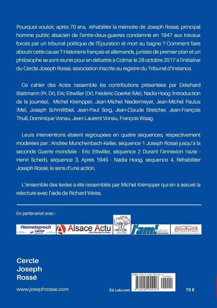 Joseph Rossé (1892-1951) est le plus éminent homme public que l'Alsace ait connu dans la première moitié du XXe siècle. Lourdement condamné en 1947 dans un procès de l'Épuration, il sort aujourd'hui de la damnation mémorielle dans laquelle il a alors été enfermé. En effet, soixante dix ans après, un Cercle Joseph Rossé a été créé en vue de le faire connaître aux jeunes génératins. Ainsi, le 28 octobre 2017, s'est tenu à Colmar un colloque binational réunissant historiens et juristes franco-allemands pour étudier la levée définitive de l'interdiction de mémoire frappant ce grand Alsacien. Le présent opus rassemble les différentes interventions présentées durant cette Journée.