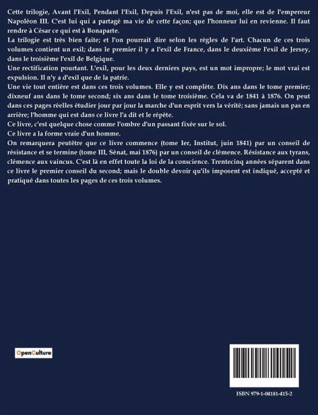 Cette trilogie, Avant l'Exil, Pendant l'Exil, Depuis l'Exil, n'est pas de moi, elle est de l'empereur Napoléon III. C'est lui qui a partagé ma vie de cette façon; que l'honneur lui en revienne. Il faut rendre à César ce qui est à Bonaparte. La trilogie est très bien faite; et l'on pourrait dire selon les règles de l'art. Chacun de ces trois volumes contient un exil; dans le premier il y a l'exil de France, dans le deuxième l'exil de Jersey, dans le troisième l'exil de Belgique. Une rectification pourtant. L'exil, pour les deux derniers pays, est un mot impropre; le mot vrai est expulsion. Il n'y a d'exil que de la patrie. Une vie tout entière est dans ces trois volumes. Elle y est complète. Dix ans dans le tome premier; dixneuf ans dans le tome second; six ans dans le tome troisième. Cela va de 1841 à 1876. On peut dans ces pages réelles étudier jour par jour la marche d'un esprit vers la vérité; sans jamais un pas en arrière; l'homme qui est dans ce livre l'a dit et le répète. Ce livre, c'est quelque chose comme l'ombre d'un passant fixée sur le sol. Ce livre a la forme vraie d'un homme. On remarquera peutêtre que ce livre commence (tome Ier, Institut, juin 1841) par un conseil de résistance et se termine (tome III, Sénat, mai 1876) par un conseil de clémence. Résistance aux tyrans, clémence aux vaincus. C'est là en effet toute la loi de la conscience. Trentecinq années séparent dans ce livre le premier conseil du second; mais le double devoir qu'ils imposent est indiqué, accepté et pratiqué dans toutes les pages de ces trois volumes.
