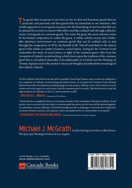 The goods that we pursue in our lives are for us, first and foremost, goods that are particular and personal, and thus goods that are immediate to our attention. Not readily apparent to us are goods necessary for the flourishing of our lives but that can be attained by us only in consort with others and thus realized only through collective action. Such goods are common goods. The wider the good, the more extensive must be the human cooperation to realize the good. A stable, orderly society and a habitable planetary environment are common goods that can be realized only in and through the cooperation of all for the benefit of all. That all contribute to the shared good of the whole is a matter of justice--social justice. Acting for the Common Good undertakes the study of social justice in light of the common good--this from the viewpoint of Catholic social teaching, which draws upon the tradition of the common good that is articulated classically in the philosophy of Aristotle and the theology of Thomas Aquinas and in the modern-day social thought and authoritative teachings of the Catholic Church.