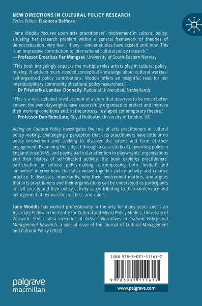 This book investigates the role of arts practitioners in cultural policy-making, challenging the perception that arts practitioners have little or no involvement in policy and seeking to discover the extent and form of their engagement. Examining the subject through a case-study of playwriting policy in England since 1945, and paying particular attention to playwrights' organisations and their history of self-directed activity, the book explores practitioners' participation in cultural policy-making, encompassing both "invited" and "uninvited" interventions that also weave together policy activity and creative practice. It discusses why their involvement matters, and argues that arts practitioners and their organisations can be understood as participants in civil society whose policy activity contributes to the maintenance and enlargement of democratic practices and values.