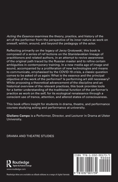 Ref lecting primarily on the legacy of Jerzy Grotowski, this book is composed of a series of ref lections on the Stanislavskian lineage of practitioners and related authors, in an attempt to revive awareness of the original path traced by the Russian master and to refine certain ambiguities in contemporary training. In a new media age of image and sound, accompanied by a proliferation of new technologies and means to communicate, emphasised by the COVID-19 crisis, a classic question comes to be asked of us again: What is the essence and the principal objective of the work of the performer? Is performing art still necessary? While proposing a theoretical advancement of the discipline and an historical overview of the relevant practices, this book provides tools for a better understanding of the traditional function of the performer's practice as work on the self, for its ecological renaissance through a conscient use of trance, attention, and altered states of consciousness.