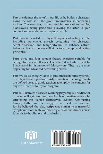 Part one defines the actor's inner life as he builds a character, living the role as if the given circumstance is happening to him. The exercises, games, and improvisations employ Stanislavski acting principles, allowing the actor to gain comfort and confidence in playing any role. Part two is devoted to physical aspects of acting a role, including movement, speech, costuming the character, script dissection, and tempo/rhythm, to enhance natural behavior. Many exercises will aid actors to employ all acting principles. Parts three and four contain theatre exercises suitable for acting students of all ages. The selected activities used by Stanislavski in his renowned Moscow Art Theatre are most appealing for advanced performing artists. Part five is a teaching syllabus to guide instructors in any school or college theatre program. Adjustments of the assignments are defined so as to guide teachers to employ the contents for any two, three or four year program. Part six illustrates dissected working play scripts. The director or actor will gain exciting new levels of creative artistry by employing this valued Stanislavski system. Contrasting tempo/rhythm and life energy of each beat was essential, for he believed the play script was similar to a masterful symphonic score with varied energy, color and dimension as it builds to the climax and conclusion.
